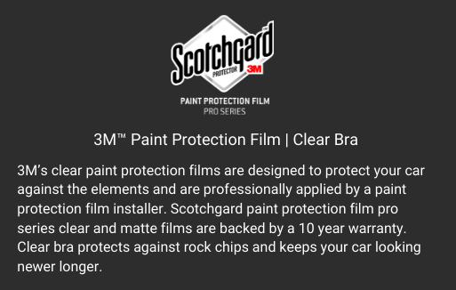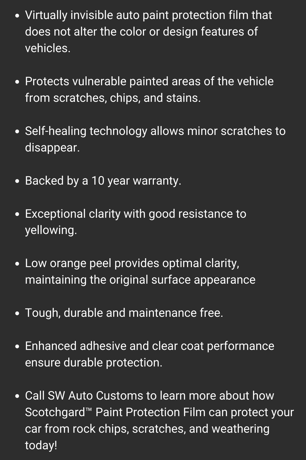 Auto Customs proudly uses 3M™ Scotchgard™ Paint Protection Film because it is extremely durable and designed to last